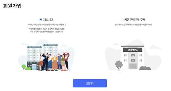공동주택 관리자가 아닌 이상 왼쪽에 있는 '개별세대'를 선택하고, 신청하기 버튼을 클릭합니다.