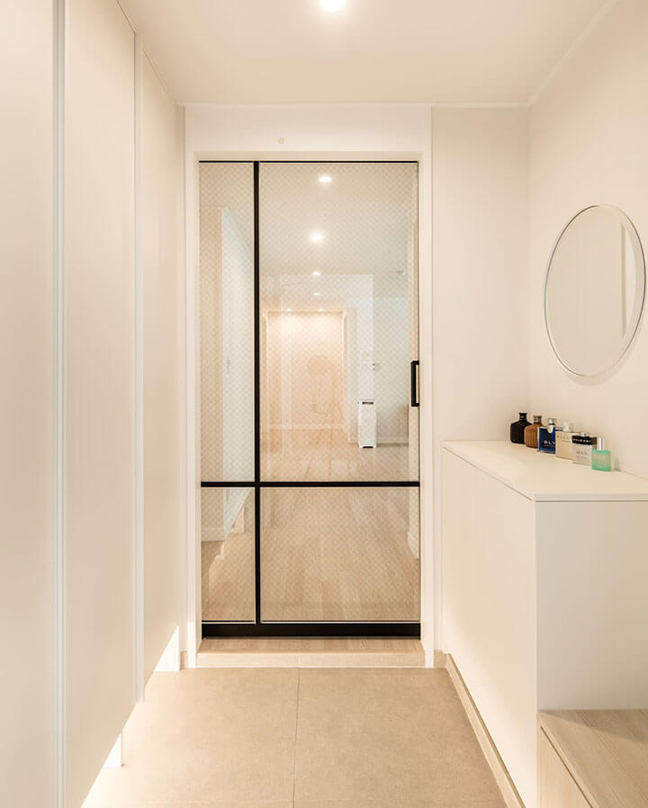 - 현관문을 열고 들어섰을 때, 밝게 조명이 비치며, 벽재나 바닥도 밝은 계통의 색을 사용합니다.
